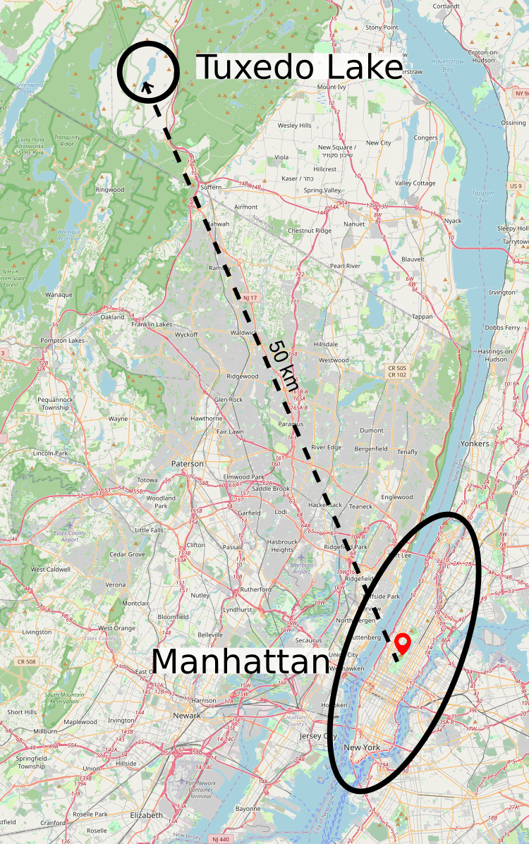 Tuxedo Lake is located about 50 kilometres North-North West from Manhattan. It is an oblong, slightly crooked depression in the hilly terrain of the Ramapough Mountains. On its sloped shores, there are small, winding roads amidst the trees, and the highly prestigious, secluded premises of Tuxedo Park.