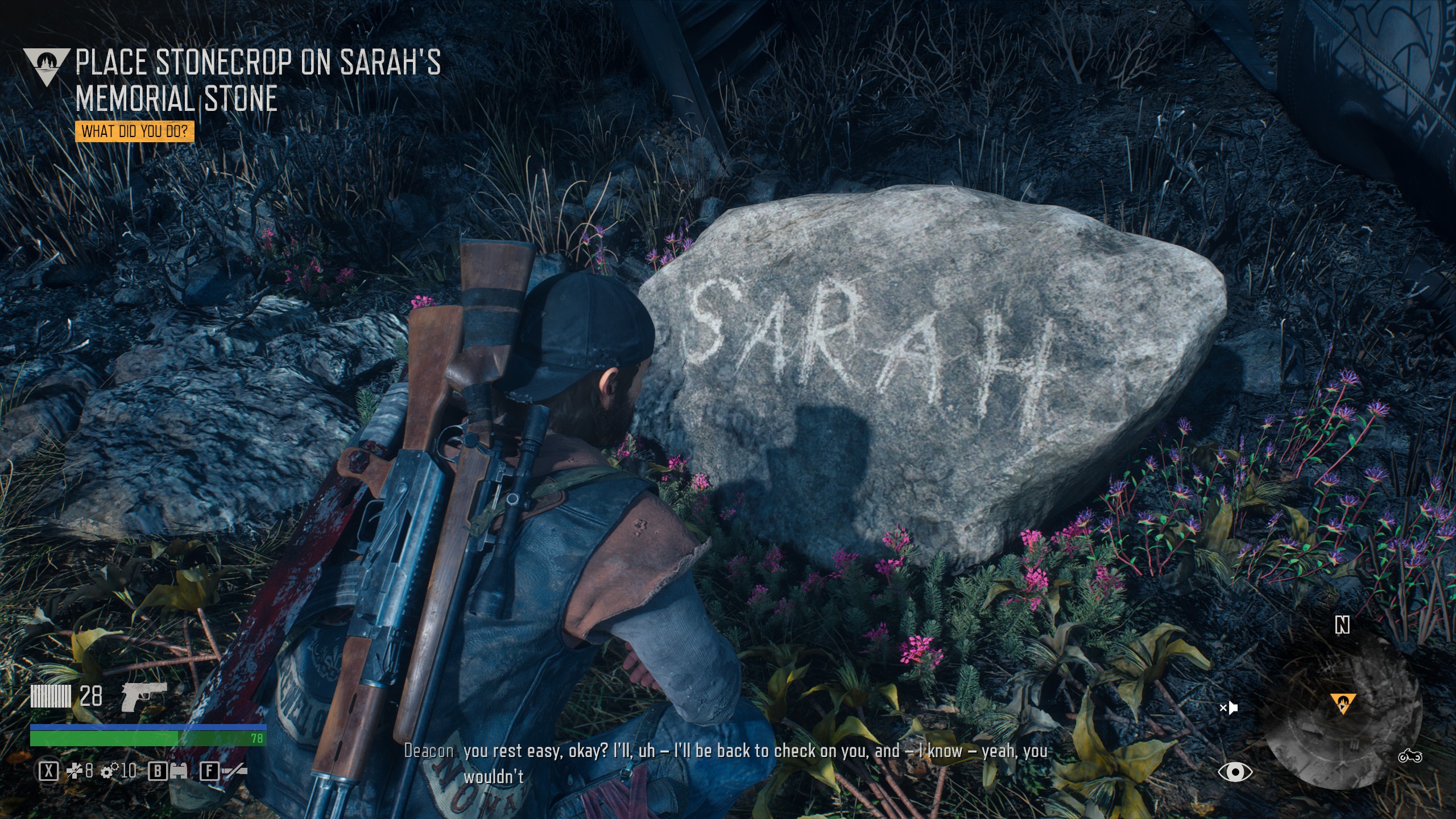 Deacon is mourning his wife Sarah, from whom he was tragically separated when the world ended and whom he presumes to have perished. A headstone has been erected for her, where the player can take Deacon to solemnly mutter his troubles.